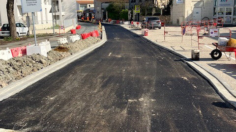 Le trottoir de droite et avec ses places de stationnement a été réalisé, et la pose de la première couche d' enrobé de la voie de circulation a été faite, ce qui permet de visualiser la configuration finale avec l'espace réservé à la piste cyclable côté gauche.
