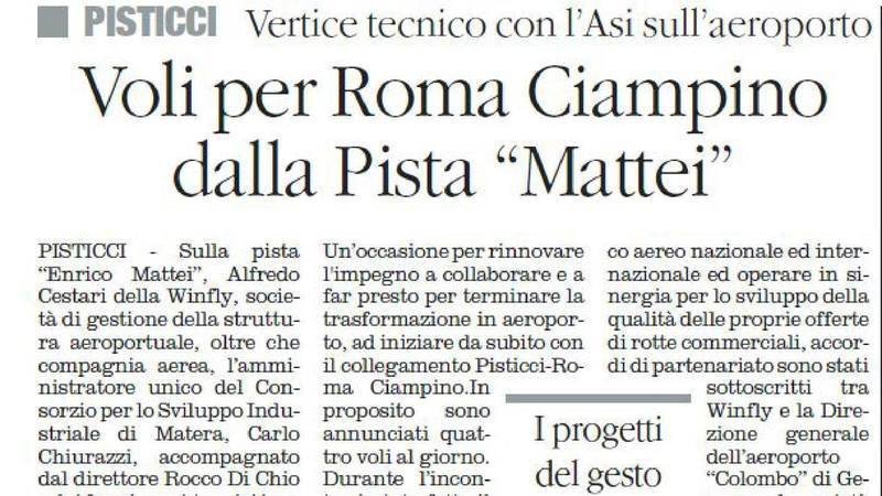 Sulla pista dell’Enrico Mattei, l’ing. Alfredo Cestari della Winfly, società di gestione della struttura aeroportuale, oltre che compagnia aerea, l’amministratore unico del Consorzio per lo Sviluppo Industriale di Matera Carlo Chiurazzi, accompagnato dal direttore Rocco Di Chio e dai funzionari-tecnici ing. Perrone, Castelluccio e Montemurro, a sugellare il rilancio della cooperazione per favorire la piena operatività dell’aeroporto Basilicata. All’incontro-sopralluogo hanno inoltre partecipato i consiglieri regionali Nicola Benedetto, Roberto Cifarelli, Paolo Castelluccio, a testimoniare l’attenzione della Regione per l’infrastruttura al servizio della Valbasento, dell’intera Basilicata oltre che di aree limitrofe del Tarantino e del Cosentino. Un’occasione per rinnovare l'impegno a collaborare e a far presto per terminare la trasformazione in aeroporto , ad iniziare da subito con il collegamento Pisticci-Roma Ciampino. In proposito sono annunciati quattro voli al giorno.