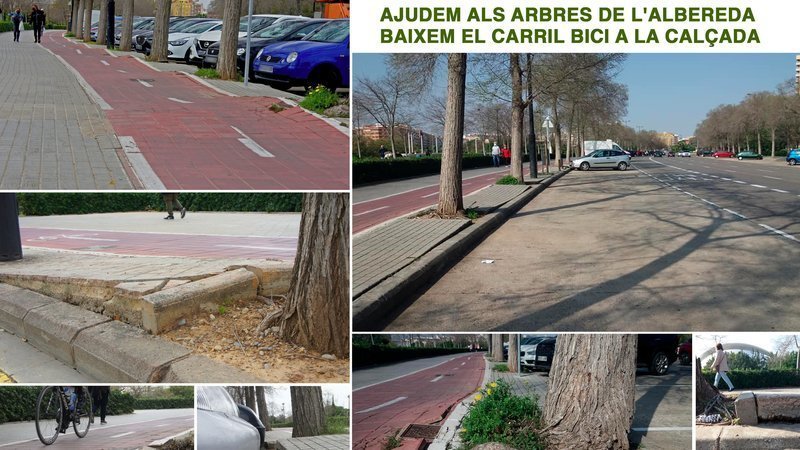 El tramo de carril bici de la Alameda que discurre por la acera entre los puentes del Reino y de Monteolivete está siendo levantado por las raíces de los árboles. La propuesta consiste en bajar de forma urgente dicho carril bici a la calzada de tal forma que el espacio liberado pueda ampliarse mediante una gran franja de tierra para que los árboles tengan más espacio vital para desarrollarse. Esta propuesta es muy sencilla de realizar pues como puede verse en las imágenes la amplitud de la calzada lo permite hacer con unos simples elementos de separación o en su caso pintura.