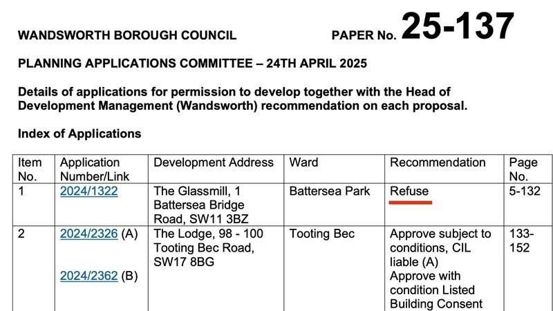 Wandsworth Council has today released a report stating that it recommends its Planning Applications Committee REFUSE the One Battersea Bridge tower.