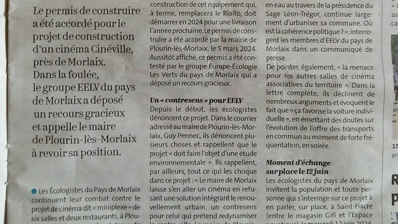 Merci au groupe EELV de Morlaix d'avoir posé ce recours contre le permis de construire qui reprend la plupart des questions que nous avions posées aux élus lors de la discussion de ce projet de multiplexe.