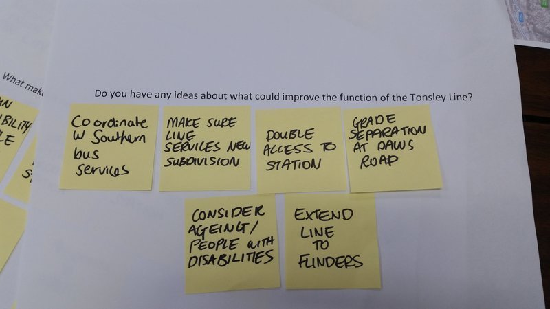 If you cannot attend Workshop 2 and you want to have your say, you still can by contacting the Tonsley Line Review.The ‘sticky notes’ presented at Workshop 1 have been recorded and can be obtained via email through savetonsleystation@gmail.com.