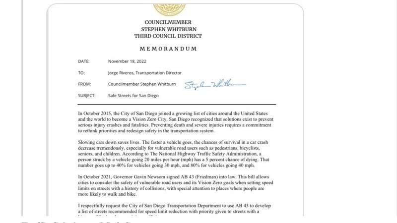 2. Councilmember Stephen Whitburn followed up the Council memo with a direct letter to the Transportation Director requesting that San Diego identify streets and use the power of AB43 to lower the speed limit.