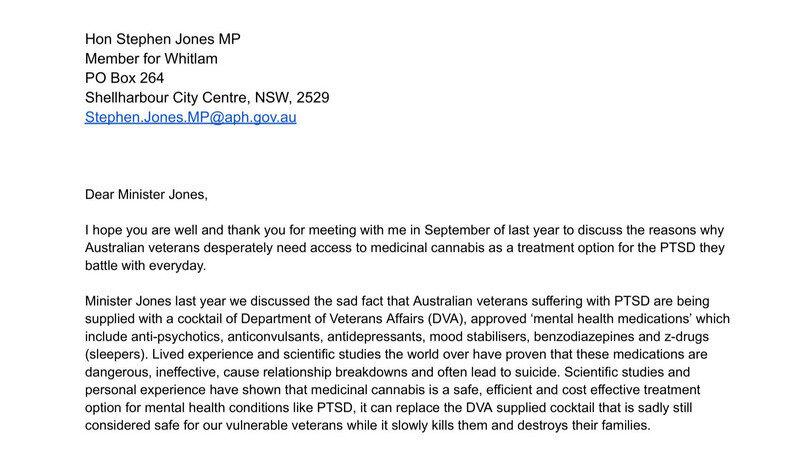 I hope you are well and thank you for meeting with me in September of last year to discuss the reasons why Australian veterans desperately need access to medicinal cannabis as a treatment option for the PTSD they battle with everyday.