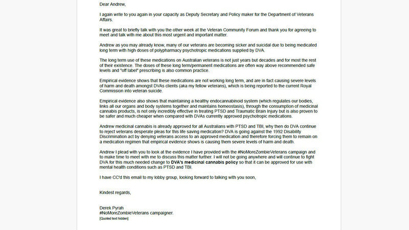 I was recently fortunate to briefly speak with DVAs Deputy Secretary of Policy and Programs, Mr Andrew Kefford PSM, about the NoMoreZombieVeterans campaign and the reasons why we are fighting for DVA to approve Medicinal Cannabis to treat our PTSD and Traumatic Brain Injurys.