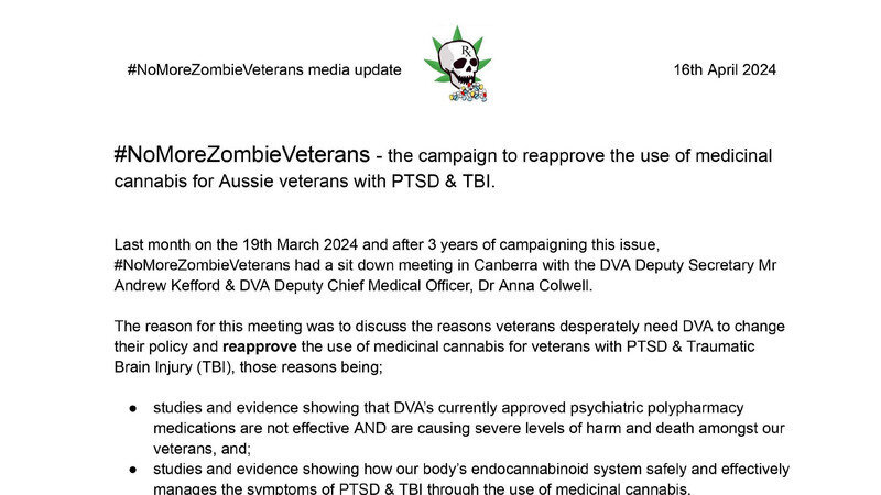 Last month the #NoMoreZombieVeterans campaign had a meeting with DVA to discuss the reasons veterans need medicinal cannabis reapproved as a treatment option for veterans suffering with PTSD & TBI.