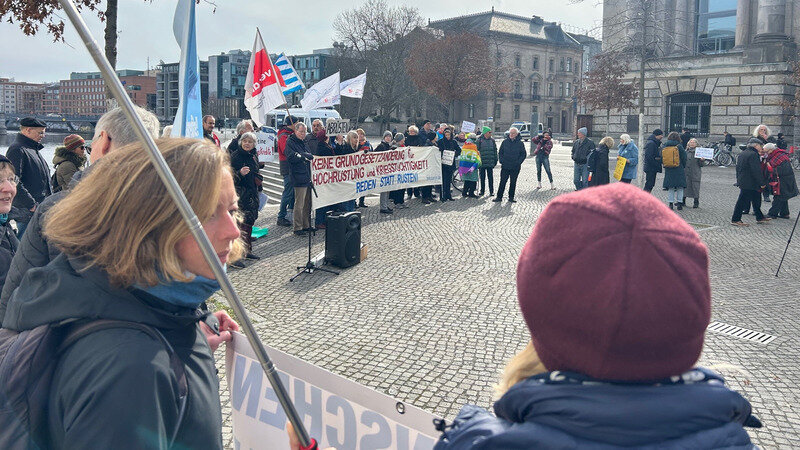 heute haben wir zusammen mit Kolleg*innen und Genoss*innen des Bündnisses ´Den Wahnsinn stoppen!´ und weiteren mehr als 60 Aktivist*innen aus verschiedenen Gruppen und Organisationen der Friedensbewegung Sorge dafür getragen, dass die Bundestagsabgeordneten nicht klamm und heimlich über die neuen Kriegskredite und das Wahnsinns-Militarisierungsprogramm der neuen Kriegsregierung abstimmen konnten.