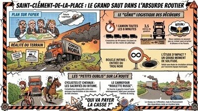 Alors que les terres issues des chantiers du CHU d’Angers sont présentées comme un moyen de « valoriser » les sols agricoles de Saint-Clément-de-la-Place, la réalité du terrain dessine un scénario inverse : destruction de la voirie, mise en danger des usagers et paralysie du bourg.
