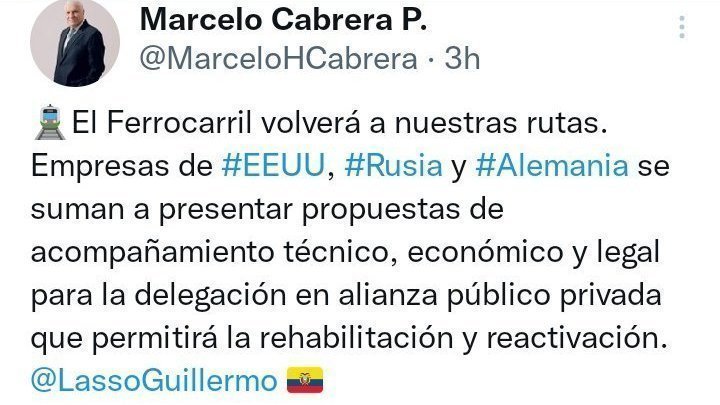 Copia este mensaje: salvemos al #FERROCARRILECUATORIANO @ObrasPublicasEc @MarceloHCabrera @LassoGuillermo y pégalo en este link: link del tuitazo