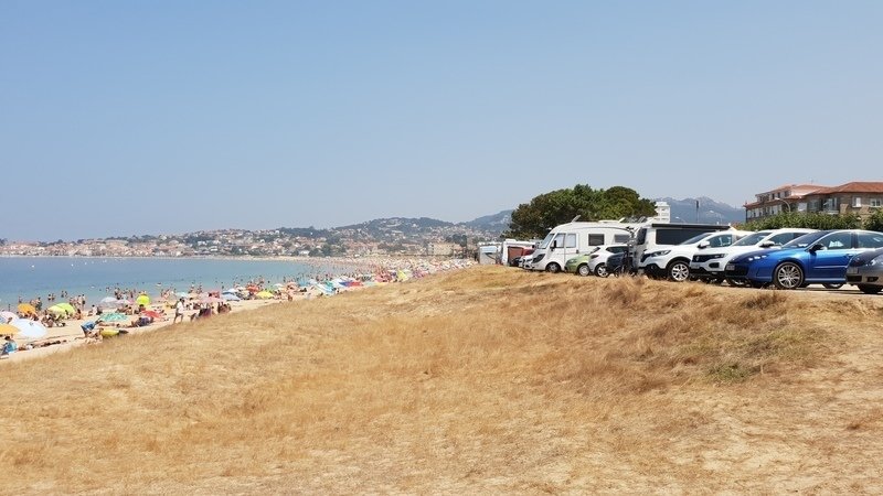 Los coches hasta la misma playa, sin linea de separación, todo el polvo en el arenal
