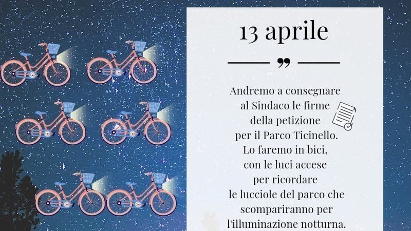 Dobbiamo essere tanti, e l’idea sarebbe (in distanza e sicurezza) simulare con le luci delle bicilette le lucciole, che tanto ci stanno a cuore e che contraddistinguono il nostro parco.