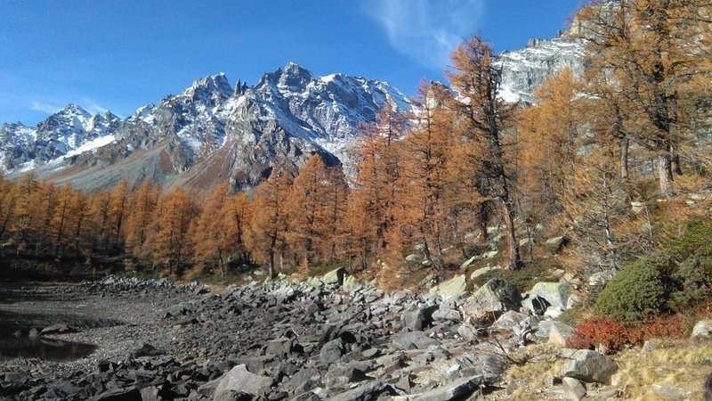 Anche al Devero i cambiamenti climatici sono evidenti: le nevi si sciolgono, le falde si impoveriscono. Nella fotografia il Lago Nero tra la Buscagna e il Monte Cazzola: un tempo specchio di alberi e cielo, colmo di acque fredde fino all'inverno, nelle ultime estati si prosciuga sempre più, quasi scomparendo in una nera pietraia.