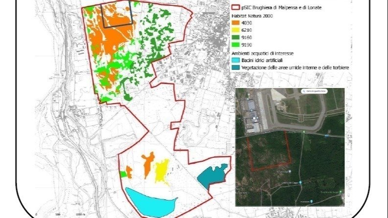Nella cartina ecco riportata nella sua interezza la Brughiera di Malpensa e Lonate ( 856 ha circa ) per cui viene proposta l'istituzione di un a zona SIC/ZPS in base alle direttive UE Habita e Uccelli. L'area si estende dal margine meridionale dell'aeroporto fino alle vasche di spagliamento dell'Arno.