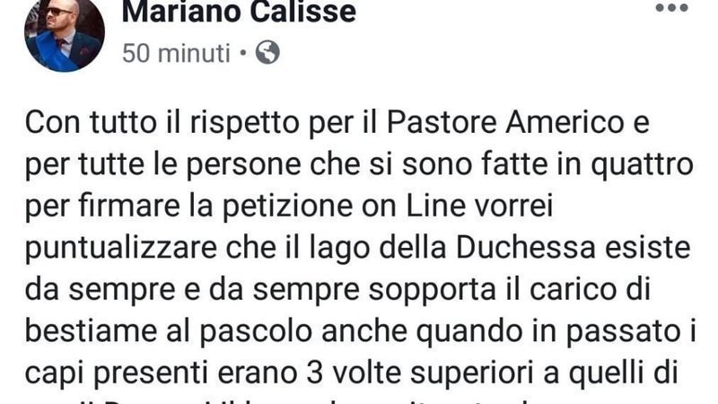 Il sindaco di Borgorose Mariano Calisse (che è anche sindaco di Cartore, Corvaro, Torano, Sant'Anatolia, ed è anche presidente della provincia di Rieti e presidente della Riserva della Duchessa) ha pubblicato sulla sua pagina Facebook (https://www.facebook.com/photo.php?fbid=1329522430537902&set=a.196148133875343&type=3&theater) una presa di posizione sostanzialmente contro di noi che abbiamo lanciato la petizione e contro chi è NON LOCALE, affermando che il lago sta benissimo (quindi contro ogni dato scientifico e contro le evidenze di chi quel lago lo conosce da 50 anni), che gli allevatori LOCALI sono gli unici ad avere diritti, che i camminatori devono rispettare senza protestare, ecc. Come se la montagna fosse proprietà di qualcuno e non bene comune.
