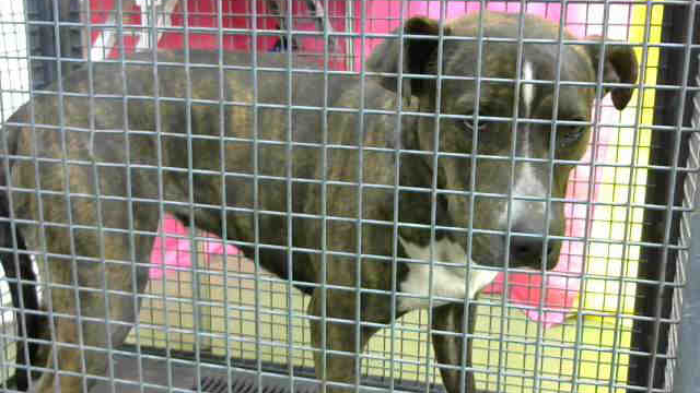 I am a female, brown brindle and white Pit Bull Terrier mix.