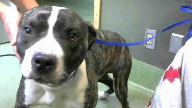 I am a male, black brindle and white Pit Bull Terrier mix.