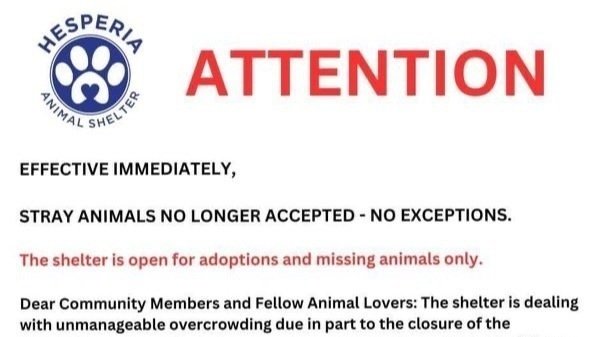 The Hesperia Animal Shelter has made it clear that they will not be accepting any new stray animals. This policy will be strictly enforced, and no exceptions will be made. The shelter remains open for adoptions and for people to search for their missing pets. However, due to the current situation, it is necessary to immediately implement emergency breeding restrictions on all licensed and unlicensed breeders in San Bernardino County. These restrictions are needed to address the issue of overpopulation and prevent the further influx of stray animals into the shelter.
