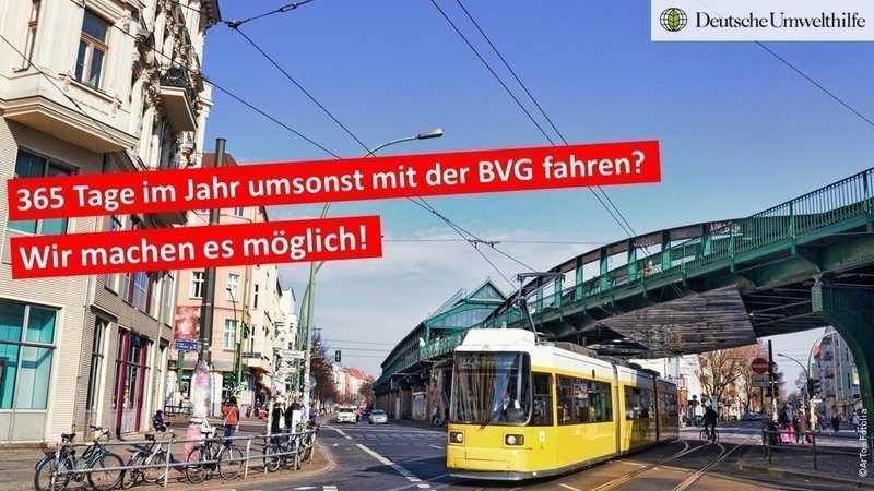 Liebe Unterstützer/innen! Bis Ende dieser Woche habt ihr die Möglichkeit eine von fünf Jahreskarten für die Berliner Verkehrsbetriebe zu gewinnen. Mit der Jahreskarte könnt ihr ein Jahr lang auf euer Auto verzichten und stattdessen den öffentlichen Personennahverkehr nutzen. Unterstützt mit dieser Aktion die saubere Luft in Berlin! Das Gewinnspiel findet Ihr auf unserer Webseite.