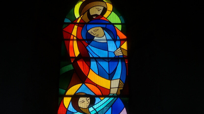 En illustration : vitrail dessiné par Louis Ribes "la sainte-famille" (Joseph, Marie et l'enfant Jésus) en l'église du village de Sainte-Catherine (69), lui aussi promis à la destruction...