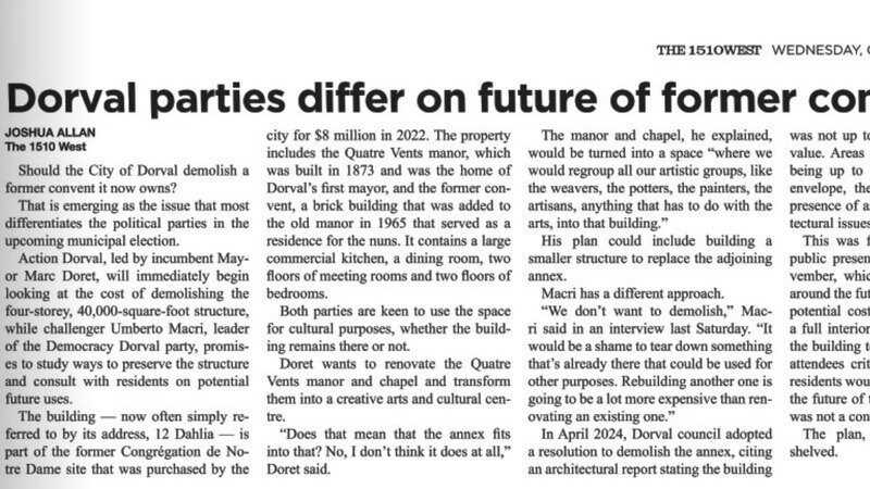 « Action Dorval, dirigé par le maire sortant Marc Doret, commencera immédiatement à examiner les coûts de démolition de l’immeuble de quatre étages et de 40 000 pieds carrés, tandis que son adversaire, Umberto Macri, chef du parti Démocratie Dorval Democracy, promet d’étudier les moyens de préserver la structure et de consulter les résidents quant à ses utilisations futures possibles. »