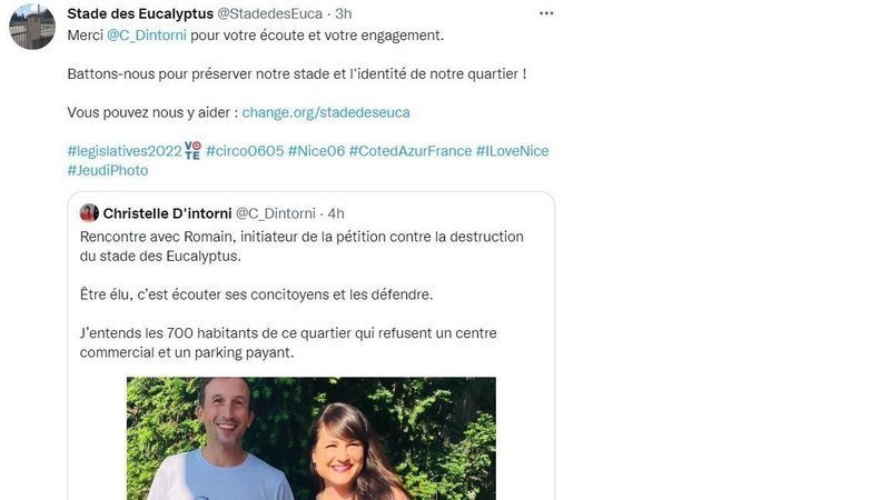 De l'autre, Christelle D'Intorni (Les Républicains), qui soutient notre mobilisation depuis le début, qui est à notre écoute et qui pourra, si elle est élue, nous aider à revoir la copie de ce projet de destruction du stade.