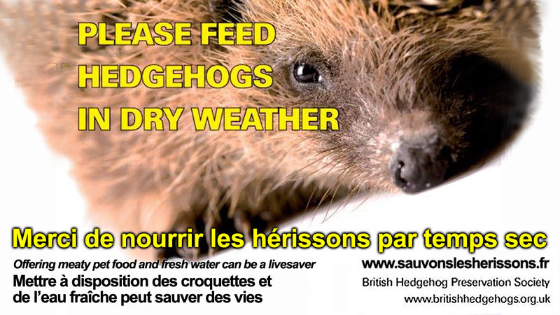 Nous avons au mois de mai des températures dignes d’un mois de juillet. Alors, comme nous encourage la très prestigieuse fondation de sauvegarde des hérissons anglaise, la British Hedgehog Preservation Society, nous devons absolument nourrir les hérissons avec des croquettes pour chat (ou pour chiens, écrasées) et de l’eau fraîche. Oui, vous pouvez sauver des vies ! Devant l’alarmante accélération de leur disparition, nous-nous devons de donner à manger à tous ceux qui ont déserté les campagnes (moins 70 % de hérissons depuis 20 ans), pour se réfugier dans nos jardins urbains, car il n’y a plus rien à manger dans les champs remplis de pesticides. Et merci de continuer à faire signer et à partager le lien vers la pétition => https://www.change.org/p/sauvons-les-hérissons-en-danger : bientôt 100 000 signataires ! Merci pour tous ces petits gestes..