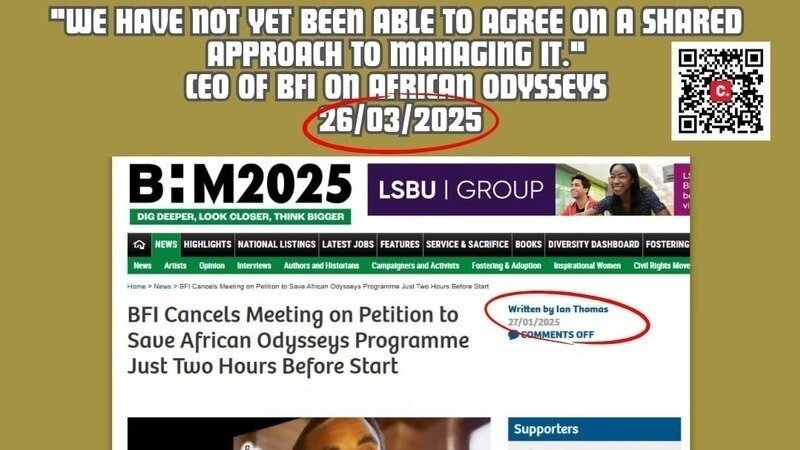 · It was the BFI that unilaterally cancelled a meeting with the African Odysseys Steering Committee including Professor Gus John, two hours before it should have started on 17th January. This was reported by Black History Month magazine HERE