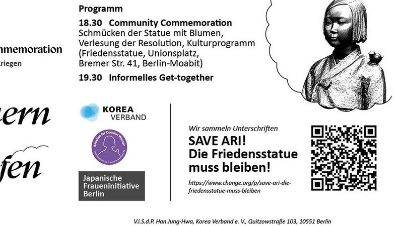 Am Mittwoch, den 19.06.2024, ist der Internationale Tag für die Beseitigung sexualisierter Gewalt in Konflikten. Dieses Jahr findet unsere Community Commemoration, zusammen organisiert von Korea Verband, AG „Trostfrauen“ und Japanischer Fraueninitiative Berlin, unter dem Titel „Erinnern heißt Trauern, Trauern heißt kämpfen“ statt. Um 18:30 Uhr kommen wir an der Friedensstatue zusammen,