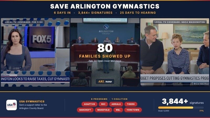 We are a coalition of eight programs — Adaptive, Rec, Aerials, Tigers, Barcroft, Wakefield, W&L, and Yorktown — united by one mission: saving Arlington gymnastics. A lot has happened in the past 6 days. Here's what you need to know.