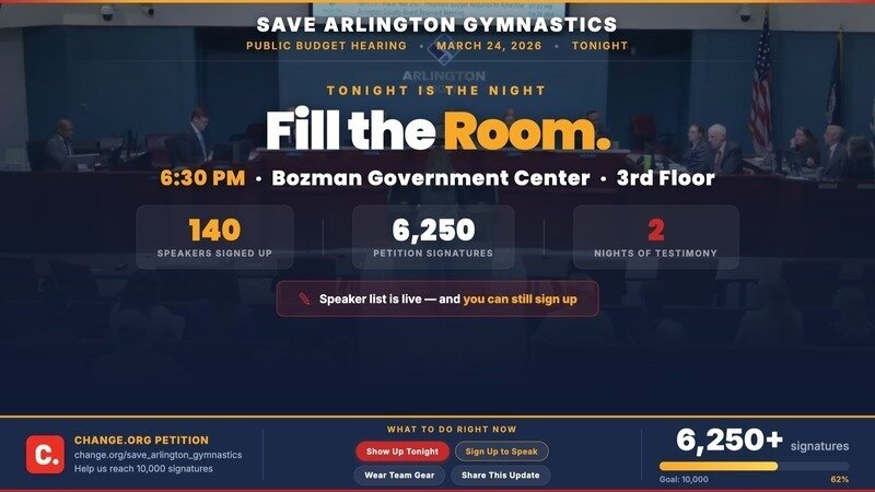 When the Board looks out from that dais tonight, they need to see a room full of people who showed up on a Tuesday and Thursday evening because they believe Arlington's gymnastics programs are worth fighting for. Every seat filled is a message. Every team jacket in the crowd is a statement. You don't have to say a word -- your presence speaks.