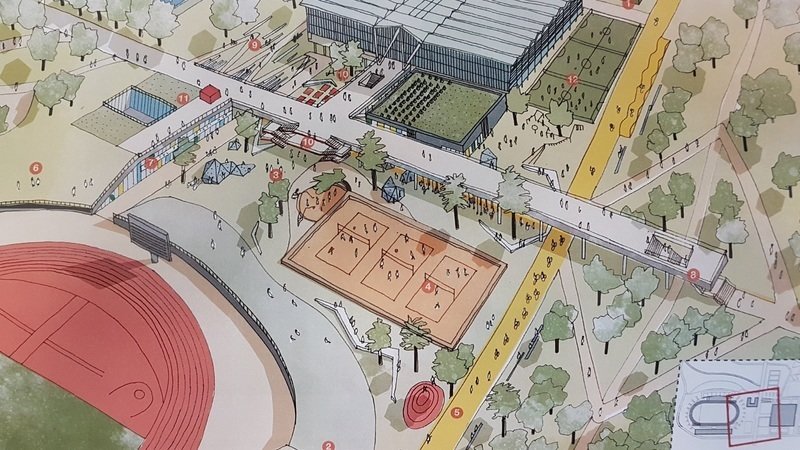 All options demolish most of the athletics stadium and Jubilee Stand, leaving just the covered seated area in the West Stand, and keeping the high level walkway to access the NSC. None of the options have an agreed budget nor agreed funding or investment plan. A brand new building to replace the Jubilee Stand is said to potentially contain a new indoor track area and weight lifting gym. The area under the existing high level walkway (currently the indoor track) would become a new outdoor public area, allowing “more informal physical activity” to provide “a pathway into sport”, say the proposals.