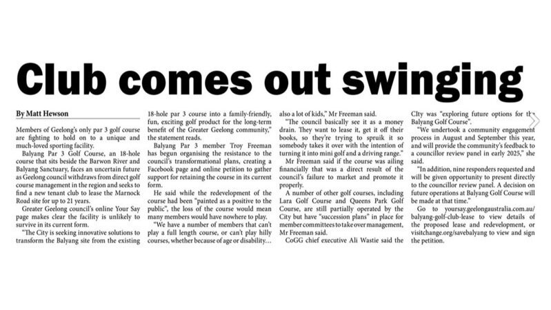 In our latest update, Geelong Independent have written and published an editorial both online and in print, detailing the fight to save Balyang Par 3 Golf Course. Source: Geelong Independent (Australia) - November 8, 2024 - Cover Page