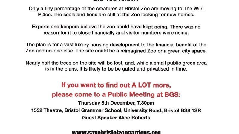 So....please come to our public meeting this Thursday 8th December at 7.30pm, 1532 Theatre, University Road, BS8 1SR to learn a lot more about the real reasons behind the Zoo’s closure, the Zoo’s plans for the Wild Place and the future of Bristol Zoological Gardens. Guest speakers to include Professor Alice Roberts. Please see the attached flyer for more info.