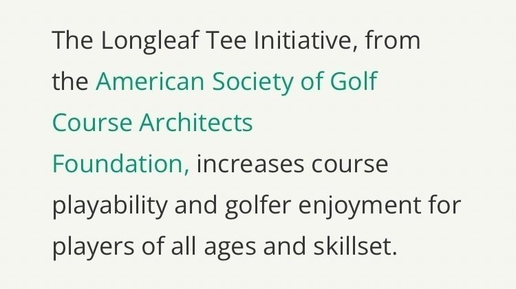 Longleaf tee system is designed for all levels of players ranging from younger children, female beginners and senior players to more experienced players. Longleaf Tee System speeds up play on a Public golf course and allows all levels of players to enjoy the game of golf.