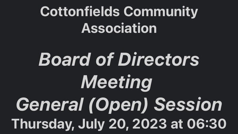 Call to action for Cottonfields Community Homeowners. Thursday, July 20, 2023 at 6:30 p.m. is the Board of Directors Meeting. There’s 450 properties in Cottonfields Community subdivision.