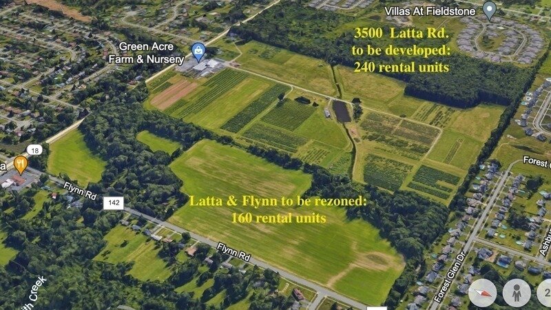 Latta and Flynn Road Rezoning Proposal – 160 rental units to be developed: The rezoning of Latta & Flynn Road would bring the development of 60 acres into 160 rental units with a clubhouse. Consider traffic, road noise, school enrollment (Hilton), wildlife wetlands (on the proposed site), single-family home values, and other factors that will forever impact our community. Attend the Town Board Meeting to share your thoughts and ask the board to vote “No” on the proposed rezoning.