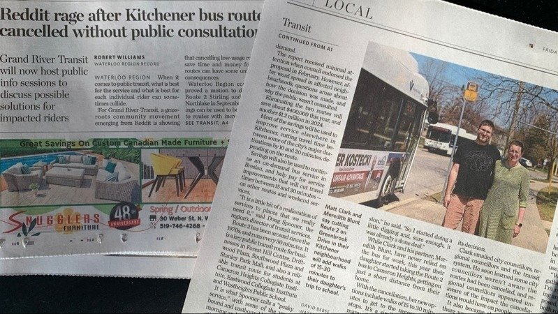 Yesterday (Friday April 14th), my husband Matt and I were featured in a Waterloo Region Record article about route #2 and the lack of public engagement. Despite the headline (which gave us a good chuckle), we appreciated the well balanced article which also highlighted GRT and the Region's side of the issue and their plan of action.