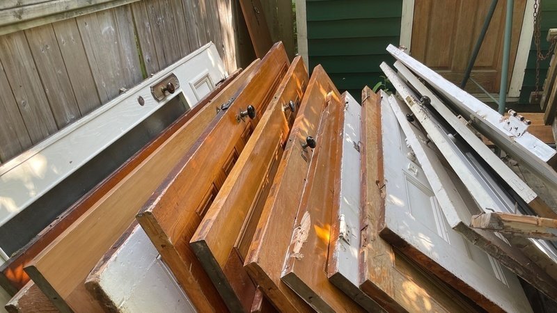 Today's "work" at the house seemed to consist of finishing hooking back up the electrical that Dal must never have connected when they purchased the home, and stacking and separating the previously demolished interior items. I counted 15 historic original doors, some, sadly damaged in their removal from their hinges - the first time in 125 years they were separated from their doorways.