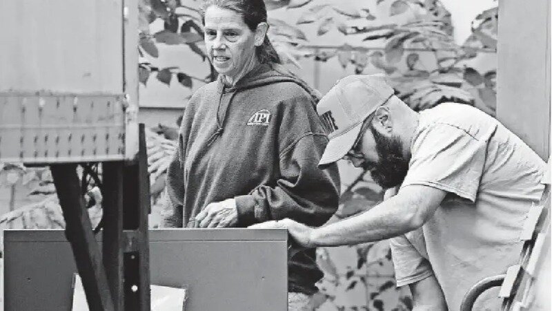 [Julia Hansen's photo from the Iowa City Press-Citizen shows Iowa Prison Industries supervisor and worker removing collections from State Historical Society of Iowa's Centennial building in Iowa City, October 6, 2025.]