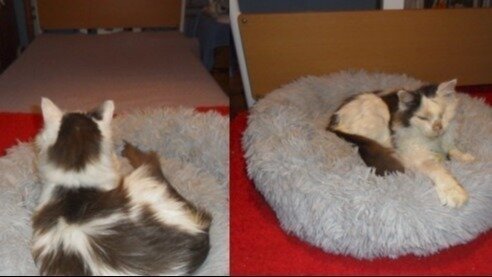 Within minutes of arriving home from the rescue centre in 2020 Sweety was laying with Karen on her bed purring as if he had known her all his life.