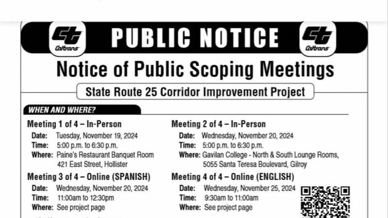 Caltrans will be holding 4 meetings for scoping changes on SR 25. Sorry I couldn't fit the full image of the announcement in here.