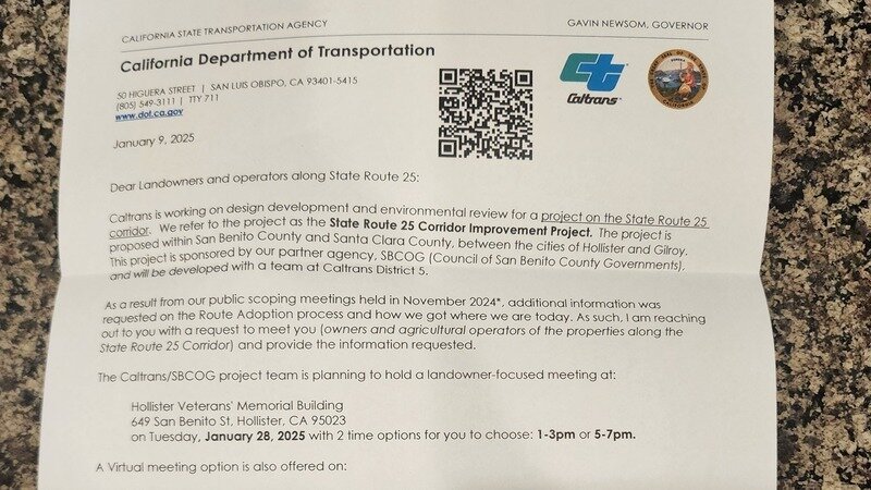 I received a call from Caltrans last Friday inviting me to their upcoming meeting. I also received a letter in the mail as well. I have a feeling that Caltrans is going to push support for the expansion. They will probably say there is no reason to put up barriers if they're going to expand 25. I'm not a landowner on that stretch so it's interesting they sent out an invite to the meetings. I will still push for k-rails because head on collisons need to stop in the mean time. Please keep sharing the petition and reach out to our Decision Makers and Caltrans as well. I cannot do this alone.