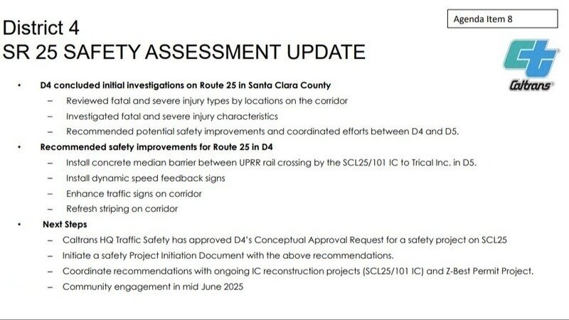 It's been a while but I wanted to provide a promising update. I received an email from Caltrans and a phone call this morning. There was a Mobility Partnership (SBCOG and VTA) meeting this morning. They discussed the ongoing project with the 101/25 ramps along with safety concerns for SR25. They did discuss the accident and safety recommendations are listed and also approved. There will be a community engagement in mid June.
