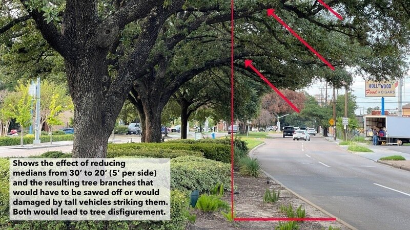 The goal worth destroying these trees? A completely reconfigured Montrose Boulevard that narrows the current medians and eliminates essentially all trees lining the streets to carve out 20 feet of pavement, 10 feet on each side, for recreational purposes including cycling on one side, even though TIRZ just installed bike lanes 2 blocks west.