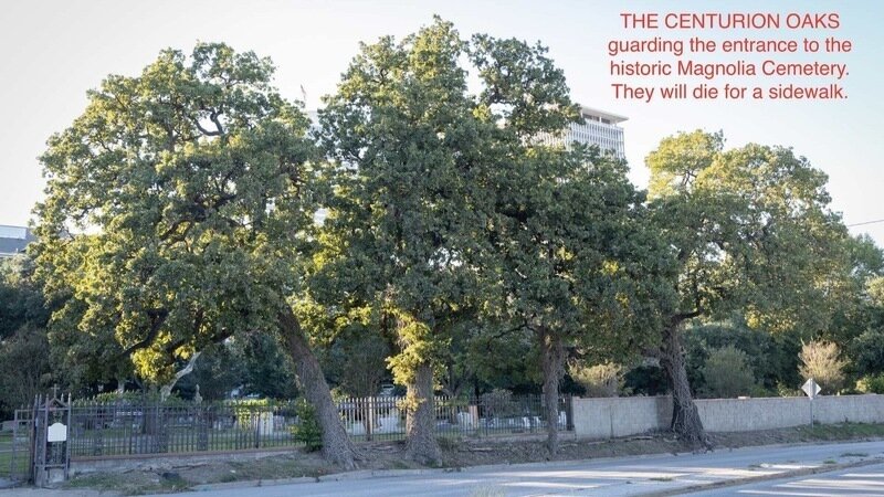 The two 150 year old 25-26” caliper healthy Post Oaks that guard the Magnolia cemetery entrance are doomed because per the TIRZ report “The project improvements, the sidewalk in particular, will likely irrecoverably impact these trees.” This very narrow area does not currently have a sidewalk. One of the main reasons it has been part of the design is because the City of Houston Public Work’s department requires builders who are putting in a new street to have sidewalks on each side. Because the TIRZ project moves the entire Montrose Blvd east towards the Ismaili center site, this is considered a new road and hence a Public Works variance would be needed to forego building a sidewalk on west side.