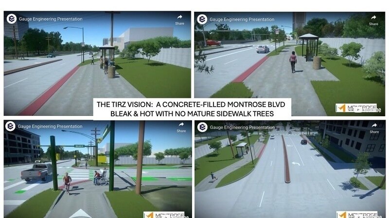 The TIRZ demonstrated its hardened position additionally with its submission on February 15, 2024 of a funding request to the Houston Galveston Area Council (H-GAC) for Phase 2 of this project which will continue the rest of the way down Montrose Blvd. to US 59. In its H-GAC submission, the TIRZ confirmed its intention to remove all trees on the east side of Montrose to at least Hawthorne Street. It also planned for dual 10-foot sidewalks that would leave no room for existent trees, disregarding the public outcry.
