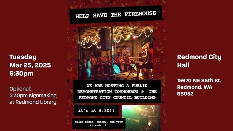 Tuesday Mar 25: Demonstration at City Hall: join us (teens, family, alumni) at 6:30pm at Redmond City Hall to let the Mayor and City Council know that we don't accept their decision to close the Old Firehouse Teen Center (before their Council Study Session at 7pm). Signmaking at 5:30pm at the Redmond Library.