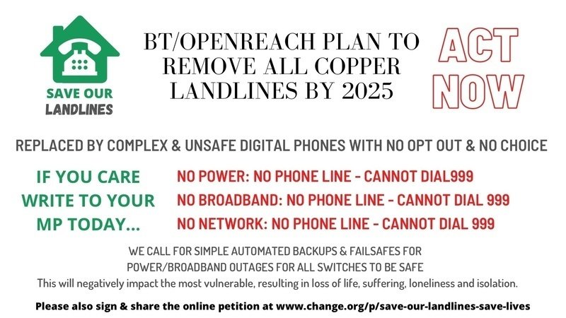 We call on BT/Openreach to successfully supply a digital service that has the automated backups and failsafes enabling emergency phone calls that are as simple to use as our current landlines, as well as automatically operational phone lines in a broadband, and/or power outage. These systems should have automatic back up power for many days not minutes, as well as be used anywhere in the UK even if broadband is down.