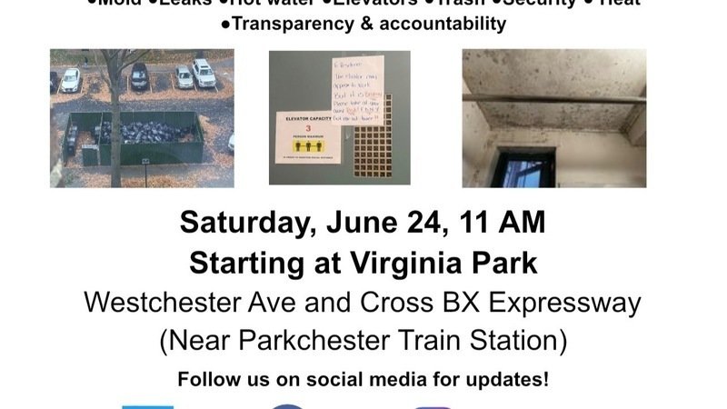 Save the date for our upcoming rally. Saturday, June 24 at 11 am starting at Virginia Park to address the quality of life issue in Parkchester including but not limited to lack of hot water, mold, elevator issues, leaks, trash collection, and heat. More details to come. Tell your neighbors and have them join our social media we need to get the word out.We