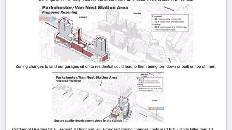 We support the new Metro North Station and new housing units in the neighbhood but oppose the height of the new zoming. R8 zoning such as planned on the vacant lot n the corner of E Tremont and Unionport Rd has no absolut height limits. A building significantly taller than our 13 story buildings in Parkchetser could be built. We oppose zoning being changed on the current site of our two garages, heat plant and management offices to anything that would permit residential buildings being built. Preserving our current garage spaces do not go far enough we need to protect the historic fabric of the 83 year old planned community which has historical significance.